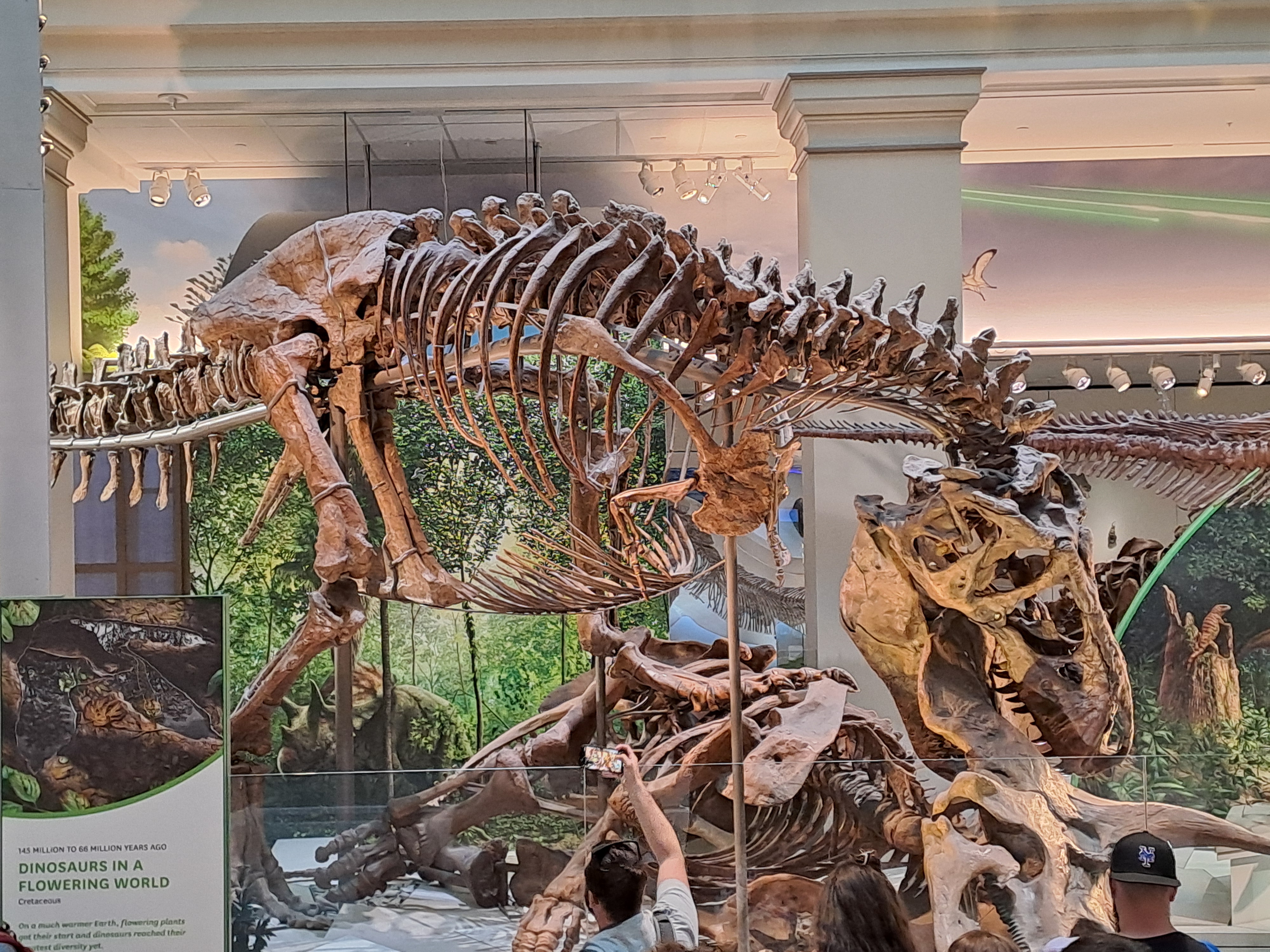 Im Verlauf der Ausstellung wurde das erklärt. Man sah Fotos der Fundorte. Die Arbeit der Archäologen und Naturforscher wurde dargestellt. Man findet selten ein ganzes Skelett. Vielmehr sah man auf den Fotos meist Konvolute von teilweise versteinerten Knochen, manchmal auch nur Knochenreste. Die Knochen waren zudem häufig über weite Strecken verstreut zu finden. Es war die Arbeit der Forscher, die einzelnen Knochen aus dem Boden und Gestein herauszulösen und zu bestimmen. Man musste zuordnen, welcher Überrest zu welchem Tier gehört. Häufig geht es dabei auch nur um kleine Knöchelchen aus der Hand oder dem Fuß des Tieres. Alles wird dann fein säuberlich aufgereiht und aufgelistet. Ein riesiges Puzzle mit fehlenden Teilen. Der Weg zu einem ganzen Skelett, das dann im Museum aufgestellt werden kann, ist unendlich langwierig und mühsam. Wir sehen als Besucher das ganze Skelett und denken: „Wie beeindruckend“. Das eigentlich Beeindruckende, die viele Arbeit und das viele Wissen, das hinter dem fertigen Aufbau steht sehen wir nicht.