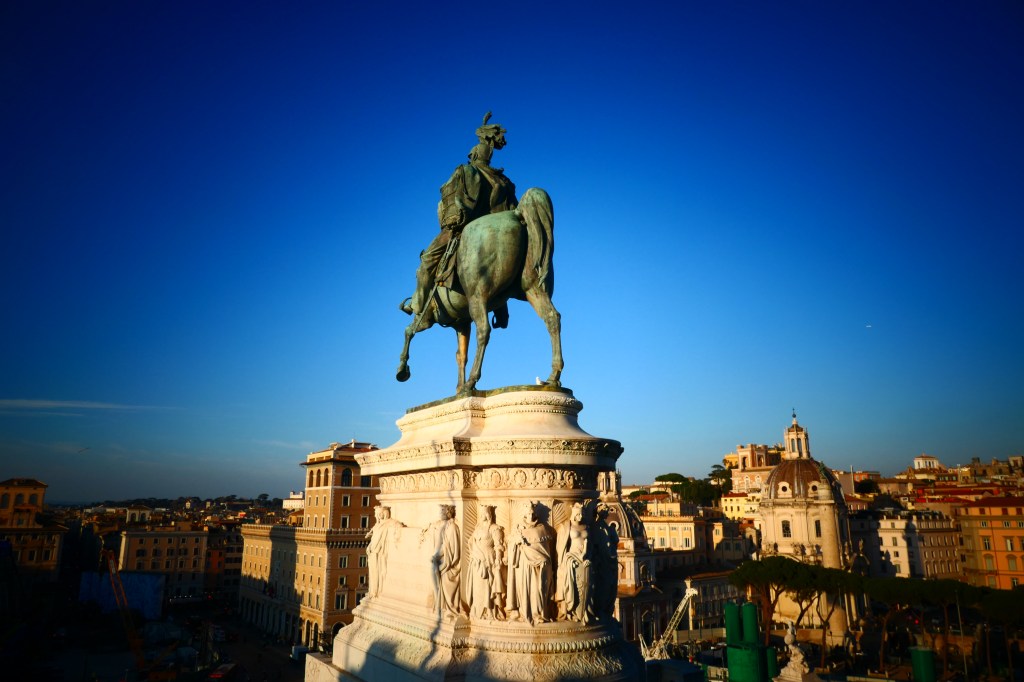 Unser Reiseprogramm konnten wir jetzt in der Vorsaison allerdings noch ohne größere Probleme durchführen. Höhepunkt war die Sieben-Kirchen-Wallfahrt, der traditionelle Pilgerweg zu den römischen Hauptkirchen – eine Tradition, die auf das Wirken des Heiligen Philipp Neri zurückgeht. Die etwa 25 Kilometer des Pilgerwegs führen einmal um die Kernstadt herum und bieten neben dem Besuch der Kirchen auch Einblicke in das „normale“ römische Stadtleben abseits der Touristenströme. Die Mischung aus Wandern, Beten und Besichtigen entschleunigt und nimmt ein wenig den Besichtigungsdruck. Man kann Rom ohnehin schwerlich vollständig besuchen – dafür braucht es mindestens einen Monat Zeit. Wir haben uns Zeit genommen und lieber weniger gesehen, dafür aber einige Dinge intensiver. Ich selbst habe zum ersten Mal den schönen Ausblick vom Vittoriano wahrgenommen, dem zentralen Gedenkort der italienischen Einheit, einem monströsen Bau, der sich einfach vor die historischen Stätten gepflanzt hat. Das Schöne: Vom Vittoriano aus sieht man dieses Gebäude nicht , dafür aber die Ausgrabungsstätten an der Via dei Fori Imperiali. Wir haben das kleine Silvester-Oratorium an der Kirche SS. Quattro Coronati mit seinen bedeutenden Fresken aus dem Mittelalter besucht, sind in der Mittagspause durch versteckte Parks geschlendert und haben eine müßige Stunde im Kreuzgang von St. Paul und auf dem Campo Santo verbracht. In aller Ruhe konnten wir in der Chiesa Nuova die Heilige Messe feiern und den Rosenkranz auf den Hügeln an der Via Appia beten. Das sind die Momente, die haften geblieben sind. Die Pilgerfahrt nach Rom ist eben mehr als der Besuch der Heiligen Pforten – auch wenn wir sie natürlich durchschritten haben.
